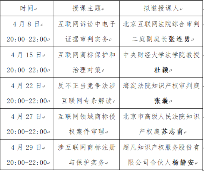 4月直播课表如下,敬请参与。五月将安排商标局资深审查员讲授异议审查实务课程(每周一次,共4次课),课程预告将发布在“中华商标协会”公号上,请多多关注支持!