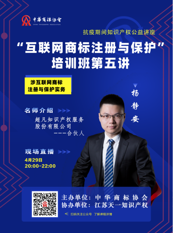 为响应国家知识产权局共同抗疫、共克时艰的号召,由中华商标协会主办、江苏天一知识产权协办的“互联网商标注册与保护”公益培训直播第五课将于4月29日(周三)在小鹅通直播平台举办,敬请期待!