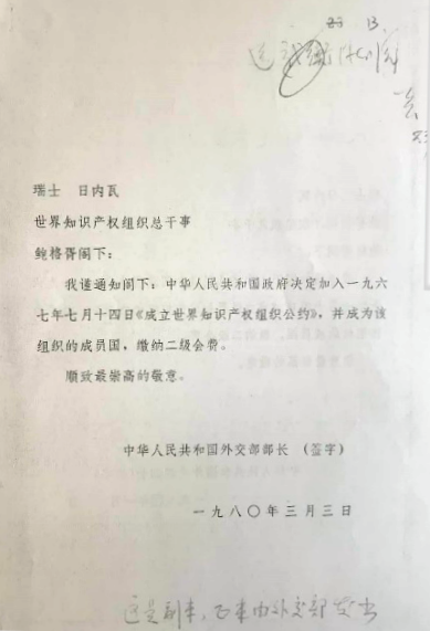 1980年6月3日,中国加入世界知识产权组织(WIPO),正式成为该组织第90个成员国,这是中国知识产权国际合作与交流一个重要的里程碑。