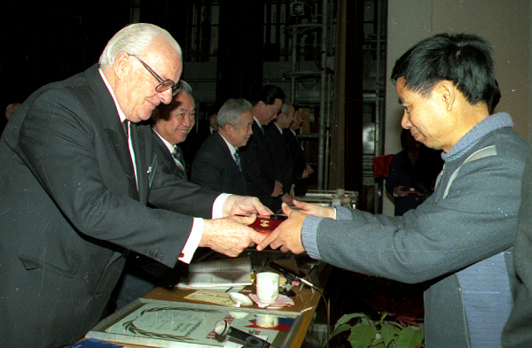 中国专利局和WIPO首次评选中国专利金奖。时任WIPO总干事鲍格胥(左一)在人民大会堂向获奖者颁奖。