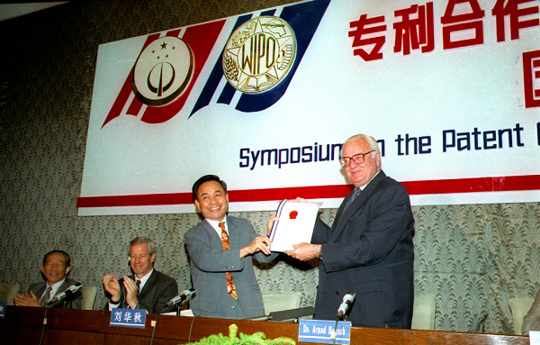 时任中国外交部副部长刘华秋(右二)向时任WIPO总干事鲍格胥(右一)递交了《专利合作条约》(PCT)加入书。1994年1月1日,我国成为PCT成员国,中国专利局成为PCT国际专利申请的受理局、国际检索单位和初步审查单位,中文正式成为PCT的工作语言之一。