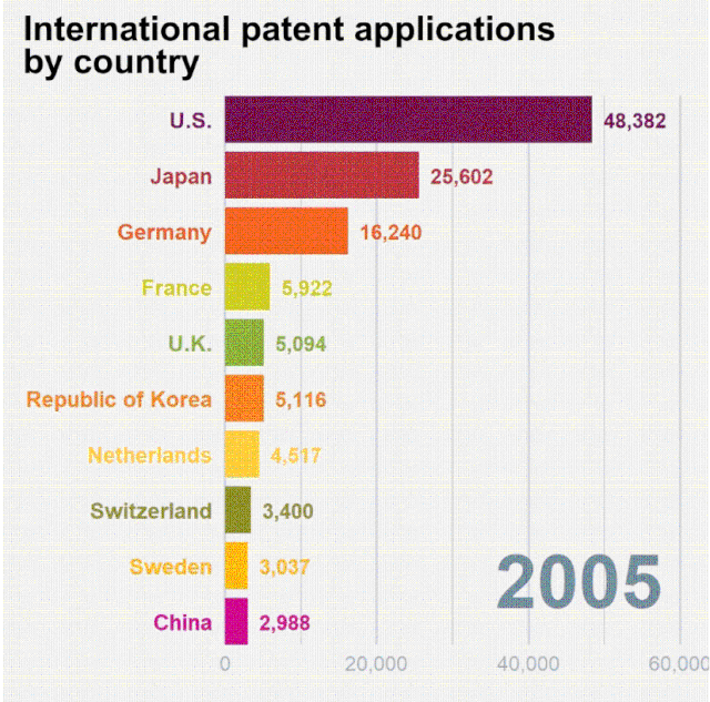 WIPO公布了2019年专利、商标和工业品外观设计国际注册数据。数据显示,2019年,中国通过PCT途径提交了5.899万件专利申请,超过美国(5.784万件)跃升至第一位,成为提交国际专利申请量最多的国家。中国通过马德里体系提交的国际商标申请量为6339件,位居全球第三。