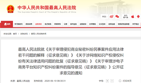 为进一步提高司法解释、司法政策质量,根据工作安排,最高人民法院就《关于审理侵犯商业秘密纠纷民事案件应用法律若干问题的解释(征求意见稿)》《关于涉网络知识产权侵权纠纷有关法律适用问题的批复(征求意见稿)》《关于审理涉电子商务平台知识产权纠纷案件的指导意见(征求意见稿)》向社会公开征求意见。请社会各界人士于2020年7月27日前,通过信件(包括中国邮政EMS)或者电子邮件方式提出修改意见。