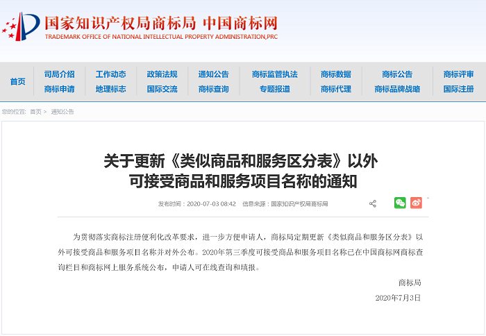 关于更新《类似商品和服务区分表》以外可接受商品和服务项目名称的通知