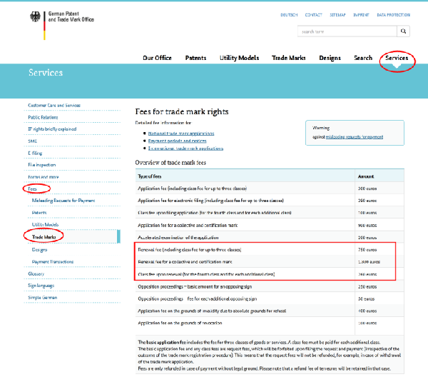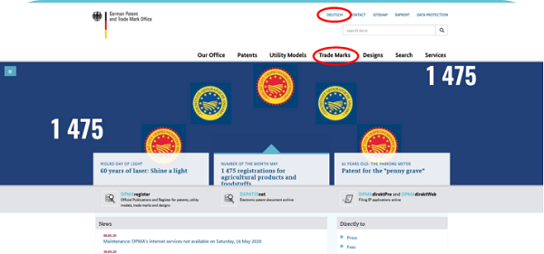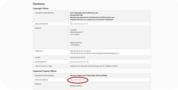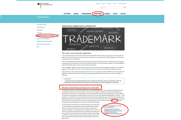 要了解国际商标申请指定德国的后续业务内容,首先通过WIPO官网首页导航栏(如下图)“Resources→Country Profiles”中的“Directory of IP offices”找到德国(Germany)德国专利商标局(German Patent and trade Mark Office)的官方网站“http://www.dpma.de/”先选择转换英语模板方便看不懂德语的朋友 ;第二步在德国专利商标局网站中,首页导航栏处点击“Trade Marks”找到“Examination, Registration and Renewal”项,进入后可以阅览详细内容;接着在“Duration of protection and renewal of a trade mark”可以找到续展相关的商标数据搜索、申请表格和费用列表。
