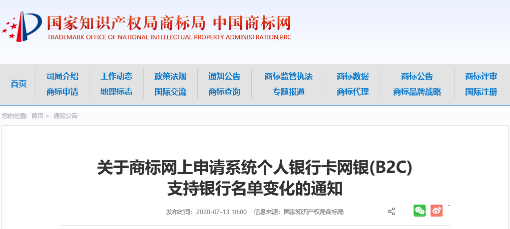 关于商标网上申请系统个人银行卡网银(B2C) ,支持银行名单变化的通知