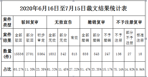 2020年6月16日至7月15日,审理签发各类评审案件28601件,同比减少3.67%,其中签发驳回复审案件23801件,同比减少7.74%,签发复杂案件4800件,同比增长23.30%,按换算工作量计算,同比增长9.24%。