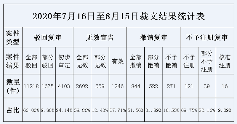 2020年7月16日至8月15日,审理签发各类评审案件23308件,同比减少24.66%,其中签发驳回复审案件16996件,同比减少38.00%,签发复杂案件6312件 ,同比增长79.06%,按换算工作量计算,同比增长21.36%。