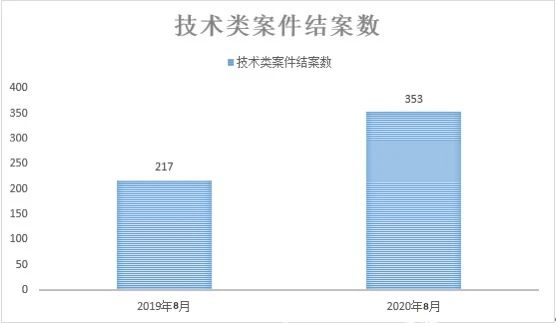 2020年8月,审结技术类案件353件,2019年8月审结技术类案件217件,同比上升62.7%。