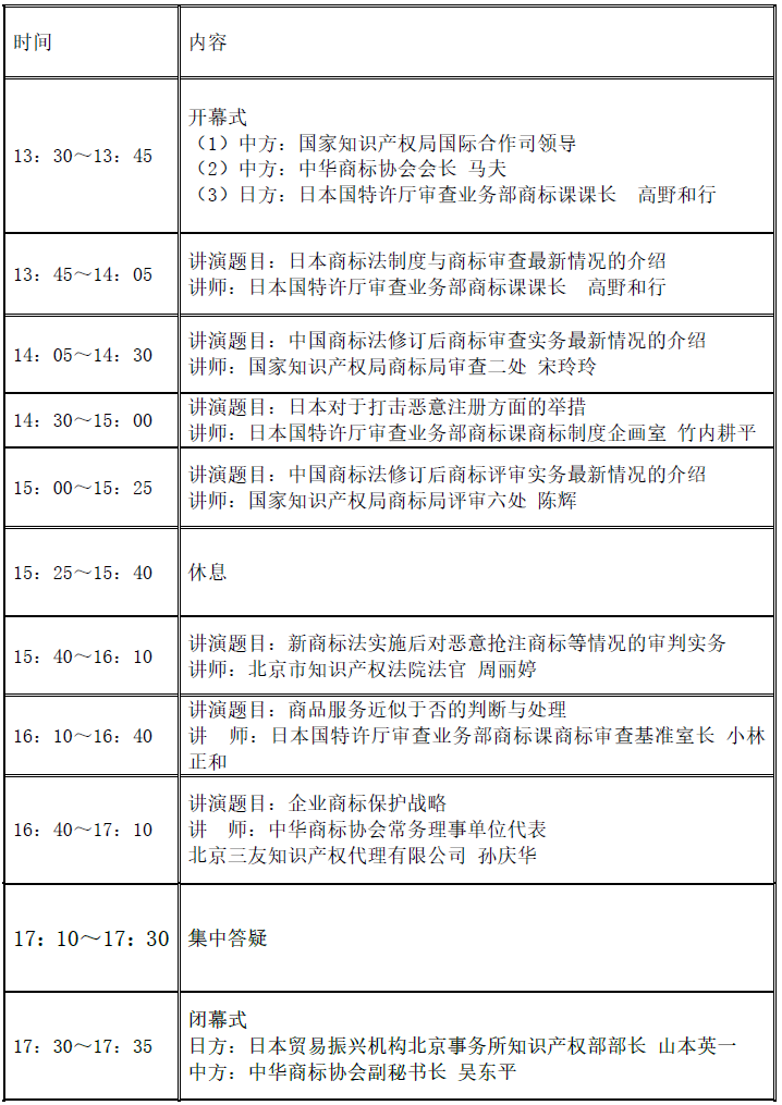近年来,我国加快知识产权强国建设,知识产权创造、保护、运用的能力显著提升,知识产权保护意识普遍提高。为进一步宣传我国商标法律制度,交流分享商标法律案件的办理经验,增进彼此相互理解,根据协会年度双边交流计划,我会将与日本贸易振兴机构北京代表处共同举办“第二次中日商标制度研讨会”。本次研讨会拟邀请国家知识产权局相关领导,国家知识产权局商标局、北京知识产权法院、日本特许厅及日本贸易振兴机构有关专家就中日两国商标申请中审查评审和新商标法修法后对相关问题的判定等内容进行授课。具体事项如下: