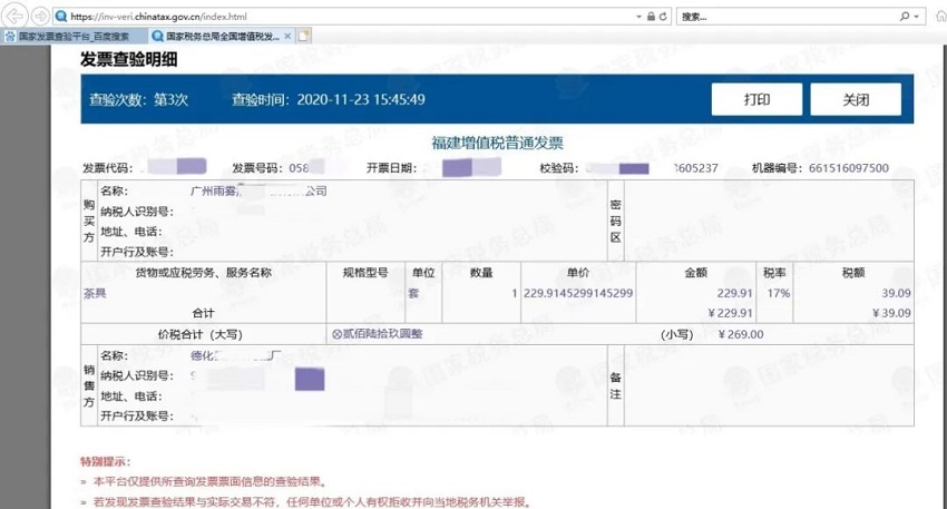 北京知识产权法院经审理发现,当事人在复审期间提交的发票证据与国家税务总局全国增值税发票查验平台查询结果不一致,具体表现在商品名称、商品品牌、销售方及纳税人识别号等信息与实际不符。