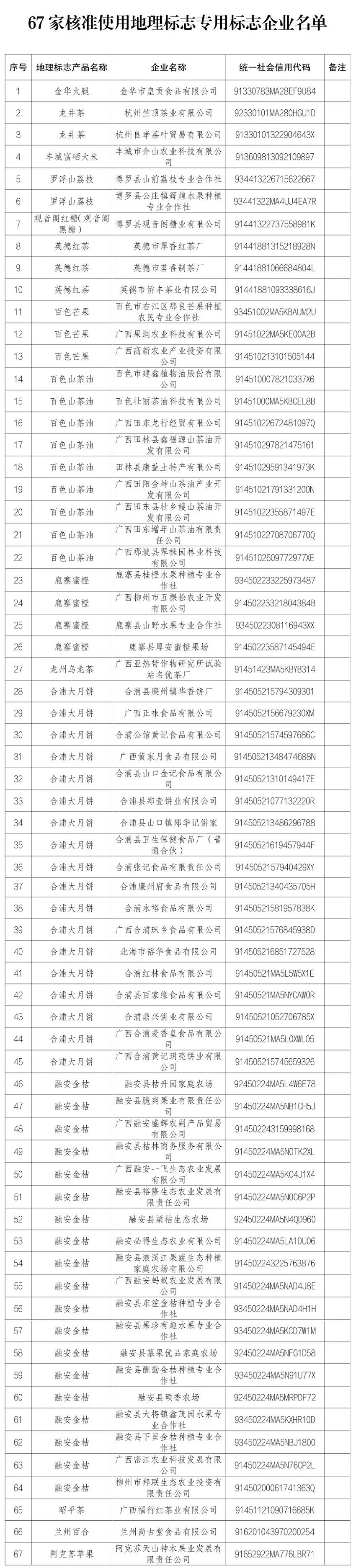 附件:67家核准使用地理标志专用标志企业名单