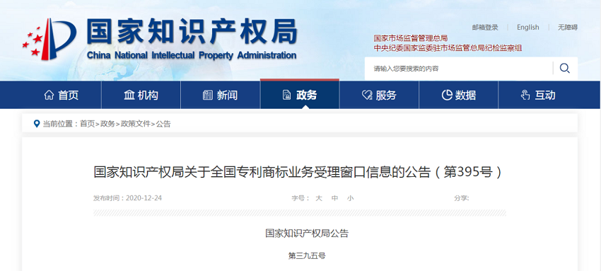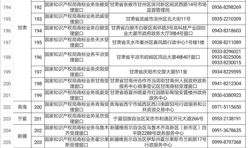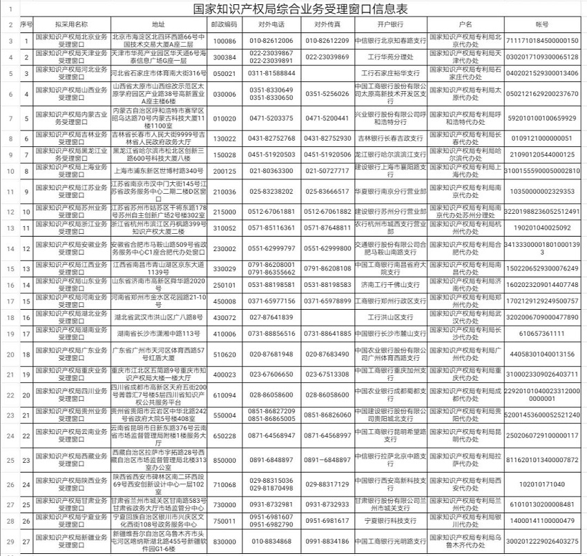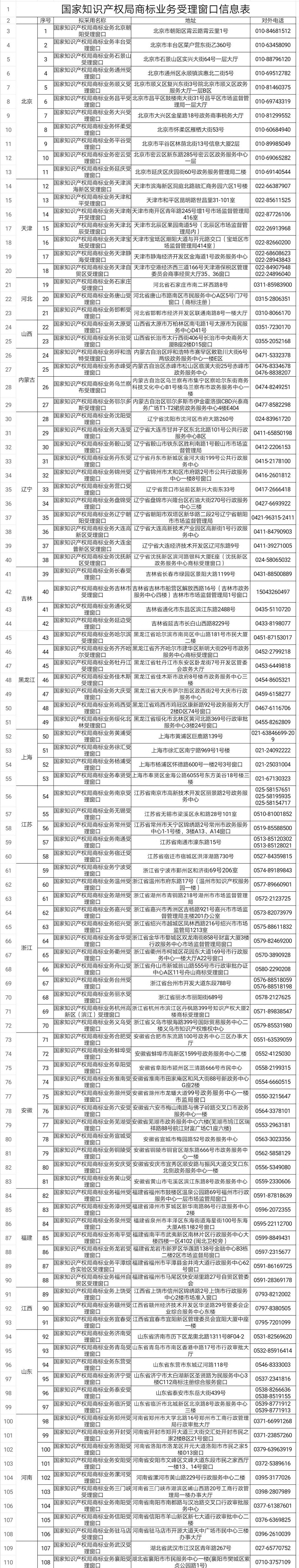 根据《国家知识产权局关于规范地方专利商标业务窗口名称 稳步推进知识产权业务“一窗通办”的通知》(国知发运字〔2020〕36号)要求,各地区积极整合优化专利商标窗口服务资源,推动知识产权业务受理“一窗通办”。现对国家知识产权局北京业务受理窗口等27个已实现“一窗通办”的综合性窗口和国家知识产权局商标业务北京朝阳受理窗口等203个已按要求规范对外名称的商标业务受理窗口信息予以公告。国家知识产权局政府网站增设“国家知识产权局业务受理窗口”专栏,对于已经公告的窗口信息发生变化的,通过网站发布信息更新,不再另行公告。