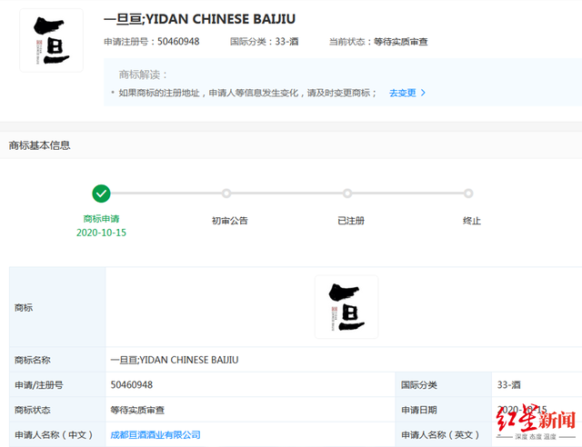 记者注意到,成都一家名为“成都亘酒酒业有限公司”的企业去年10月提交了一份商标申请,商标名称为“一旦亘;YIDAN CHINESE BAIJIU”。