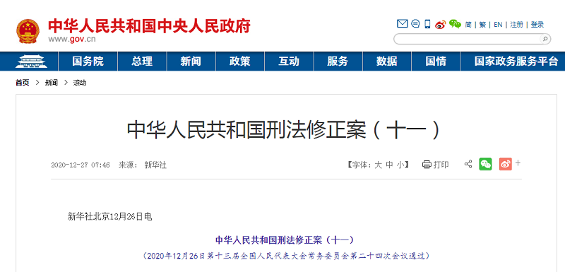 2020年12月26日,第十三届全国人民代表大会常务委员会第二十四次会议通过中华人民共和国刑法修正案(十一),自2021年3月1日起施行。