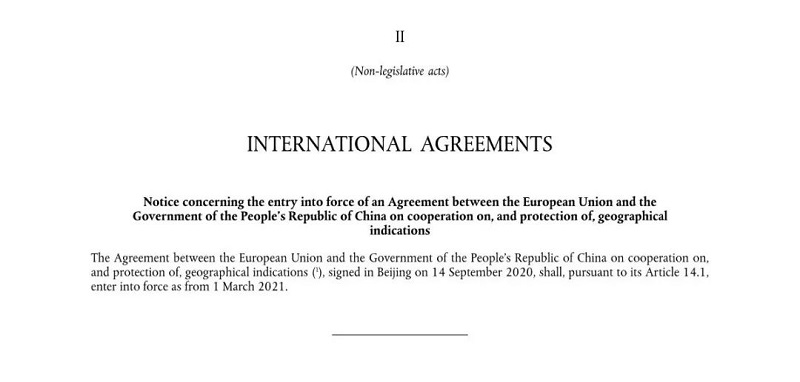 此前,欧盟委员会已于2月9日发布公报,确认中欧地理标志协定于3月1日在欧盟生效,第一批100个中国产品也同步在欧盟全境获得地理标志保护。截至目前,中欧双方通过单独申请、互认试点和协定互保等模式累计实现110个中国地理标志在欧保护,134个欧盟地理标志在华保护。国家知识产权局发布地理标志认定公告,标志着中欧地理标志协定实施工作迈出坚实的一步。