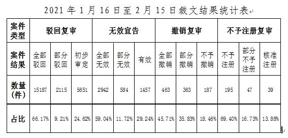 2021年1月16日至2月15日,审理签发各类评审案件29231件,同比增长210.31%,其中签发驳回复审案件22953件,同比增长176.34%,签发复杂案件6278件,同比增长463.55%,按照驳回复审与复杂案件比例为1:8计算,折合工作量同比增长325.00%。
