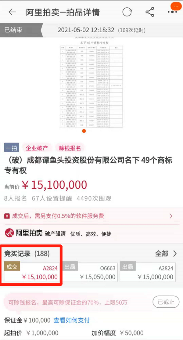 5月2日12点19分,经过188次竞价和169次延时,“谭鱼头”名下49个商标终于以1510万元价格成交。因竞价过于激烈,原本上午10点就该结束的拍卖,169次延时至12时19分方结束。