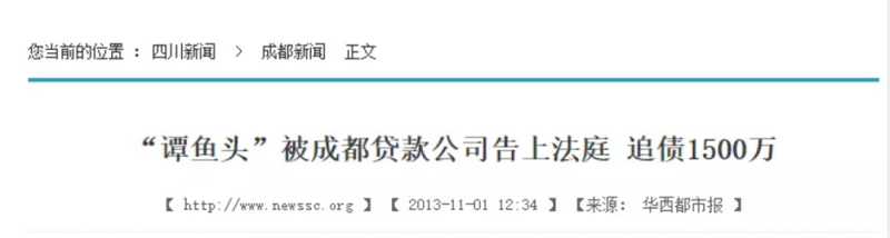 如同多米诺骨牌,第一块倒下的,用谭长安的话来说,是一个“豆腐块”大小的消息:2013年,四川媒体发布消息称,一家小贷公司将谭鱼头投资公司和谭长安告上法庭,要求其立即偿还借款本金1500万元及利息220余万元。