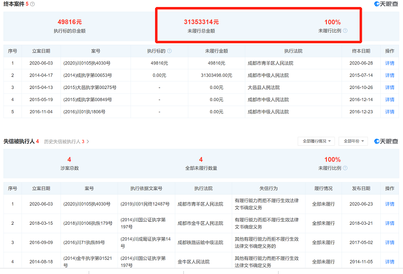 而如今,天眼查显示,谭长安因没有可执行财产,已有5起案件被暂时中止执行,而这5起案件的涉及金额超3100万元,未履行比例为100%。