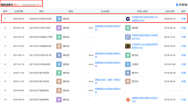 谭长安也多次被限制消费。最近的一次是2020年6月,由中国建设银行股份有限公司成都岷江支行申请。谭长安欠建行成都银行不到5万的金额。截至2018年3月27日,谭长安尚欠建行成都岷江支行借款本金44921.69元、利息2954.52元、罚息1126.94元。