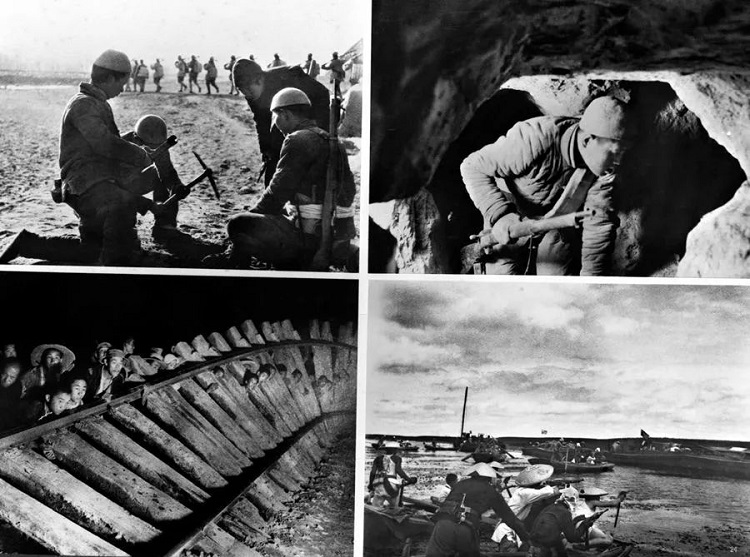 在反“扫荡”、反“清乡”的斗争中,华北平原敌后军民创造了很多有效的歼敌方法,发展了人民战争的战略战术,狠狠打击了日寇。上图左:地雷战。上图右:地道战。下图左:破袭战。下图右:水上游击战。新华社图片