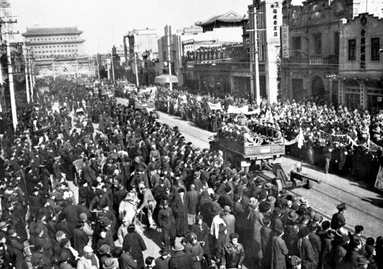 北平市民在正阳门大街上夹道欢迎参加入城式的人民解放军。新华社图片