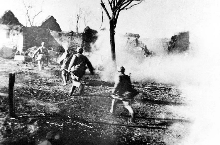 在淮海战役中,人民解放军突破浓烟密火,扑向国民党军的指挥所鲁楼。新华社图片