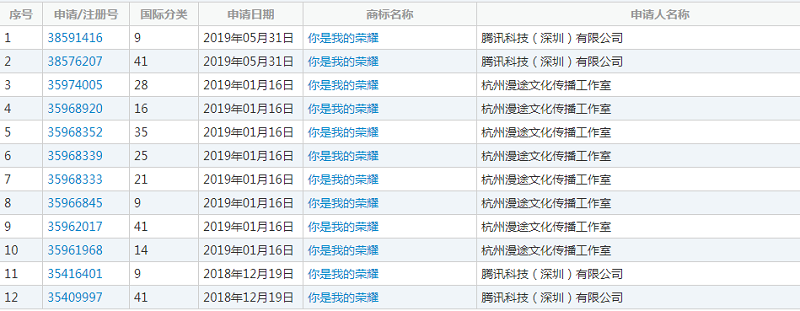 2018年12月19日,顾漫尚未将小说创作完成时,腾讯公司就分别在第9类和第41类将“你是我的荣耀”作为商标申请注册。