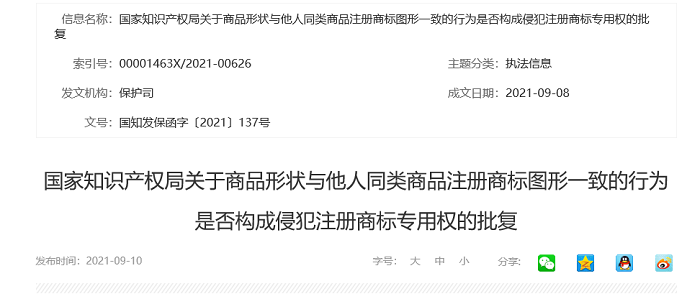 《关于销售商品形状与他人同类商品注册商标图形一致的行为是否构成侵犯注册商标专用权的请示》(川知函〔2020〕16号)收悉。经研究,现批复如下: