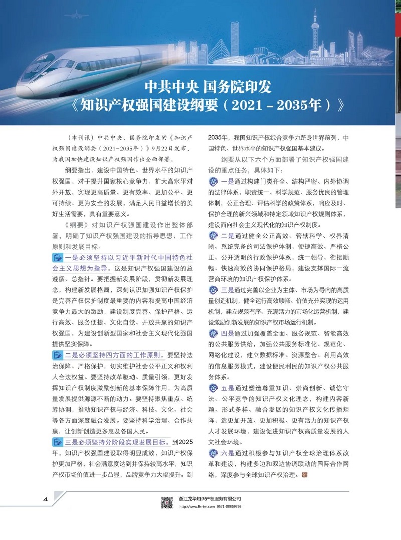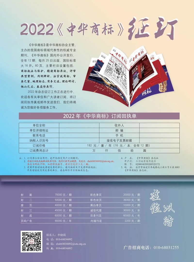 总第289期《中华商标》2021年第9期。本期设有“自主品牌献礼建党100周年”“商标执法与保护”“精读商标异议、评审典型案例”“审查之窗”“判例辨析”“法官说商标”“地理标志”“理论研讨”等栏目,敬请关注。