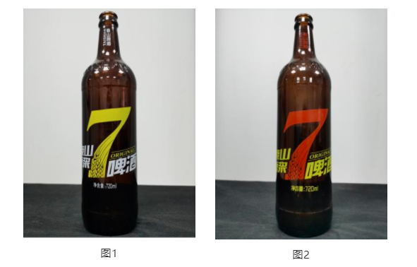 2016年,泰山公司推出两款泰山原浆啤酒。其中一款瓶体正面主标贴包含白色文字“泰山原浆啤酒”和黄色数字“7”,容量为720ml(见图1);另一款瓶体正面主标贴包含黄色文字“泰山原浆啤酒”和红色文字“7”,容量为720ml(见图2)。
