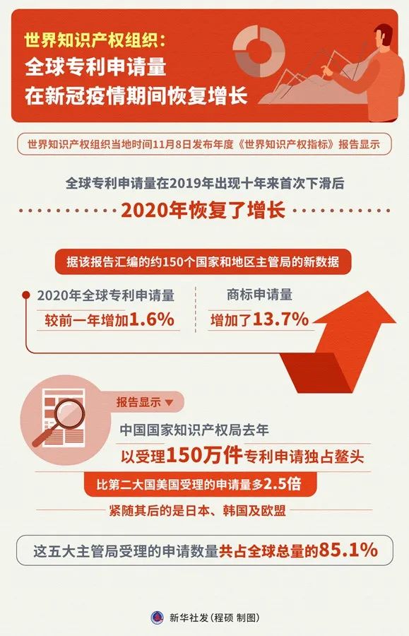 据该报告汇编的约150个国家和地区主管局的新数据,2020年全球专利申请量较前一年增加1.6%,商标申请量增加了13.7%。