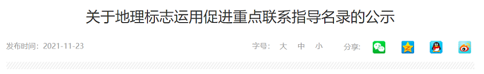 按照《国家知识产权局关于组织开展地理标志助力乡村振兴行动的通知》(国知发运字〔2021〕20号)要求,经省级知识产权局审核推荐、我局综合评定,并结合各地实施国家地理标志运用促进工程项目以及筹建国家地理标志产品保护示范区情况,确定地理标志运用促进重点联系指导名录,现将名单予以公示(详见附件),公示期为3个工作日(2021年11月23日至2021年11月25日)。