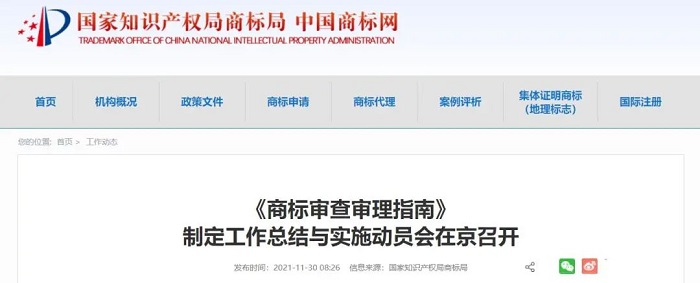 11月26日上午,《商标审查审理指南》(以下简称《指南》)制定工作总结与实施动员会在中国商标大楼召开,国家知识产权局副局长何志敏出席会议并讲话。会议总结了《指南》制定的工作经验,表扬了在制定工作中涌现出的先进集体和个人,并对下一步贯彻实施《指南》、继续推进商标注册审查提质增效进行部署动员。