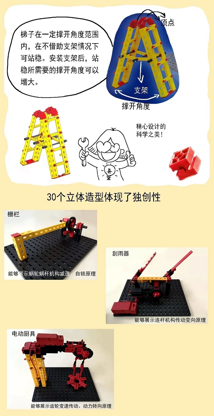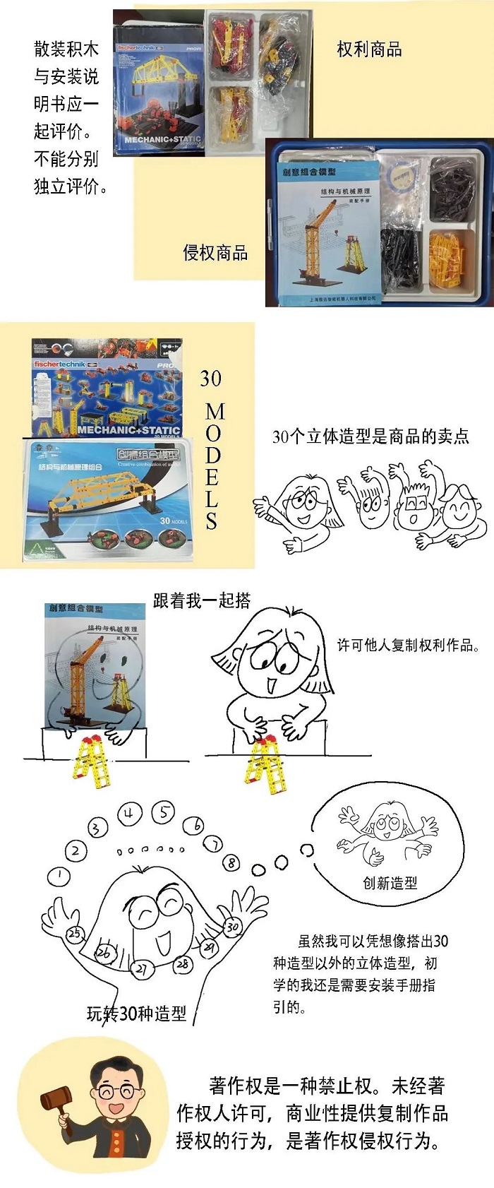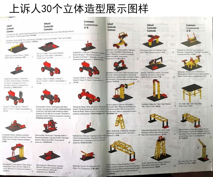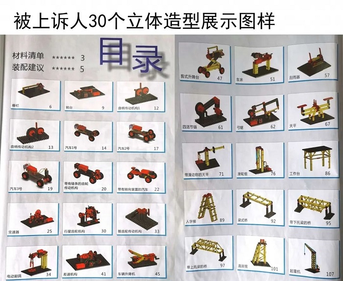 费希尔技术有限公司从事创意组合模型的研发、制造和销售。自2000年起,其产品进入中国市场,主要用于大学生创新教育的教学实践,在全国高校中具有一定的知名度。本案权利商品系由上诉人于2004年推出,内含拼装组件及安装说明书,消费者可以依照安装说明书所载拼装步骤分别搭建成30种展现不同机械结构原理的立体模型。消费者还可以根据自己的创意搭建出30种之外的造型。两被上诉人生产、销售的被控侵权产品亦内含与权利商品相同的拼装组件且附装配手册,装配手册中的展示图与权利商品实质相同。两被上诉人在展会现场陈列的搭建完成的部分立体造型与权利商品相同。