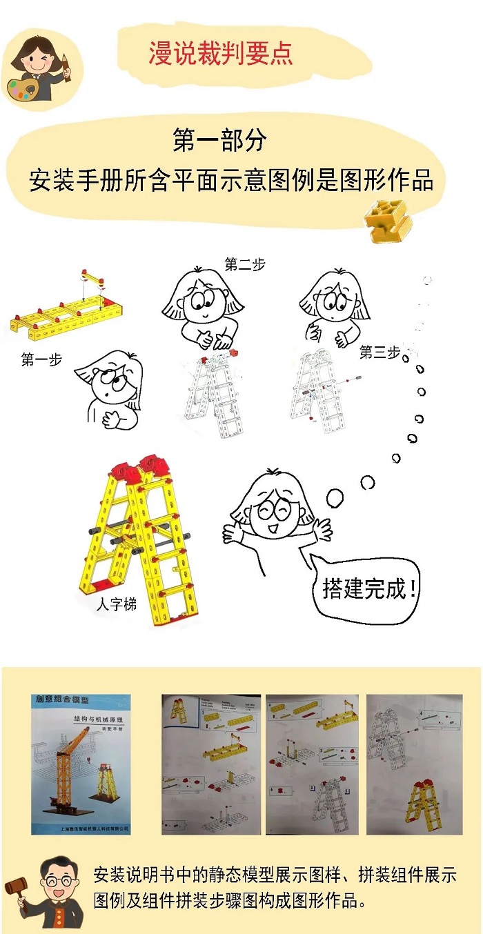 上海市徐汇区人民法院经审理认为,安装说明书中的102幅拼装组件图例、30种静态模型图样、30种组件拼装步骤图示,分别构成图形作品、示意图作品。被控侵权产品装配手册中记载相应图样与上述作品构成实质性相同,两被告复制、发行装配手册,构成对上述作品复制权、发行权、署名权的侵害。