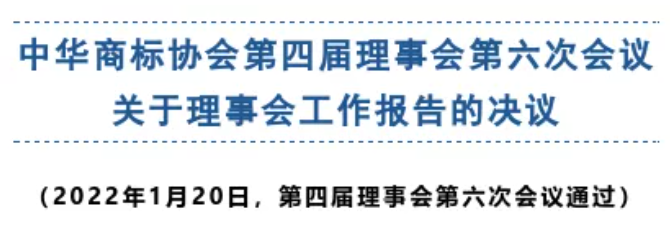 2022年1月17日--20日,中华商标协会第四届理事会召开第六次会议,就马夫会长《中华商标协会第四届理事会第六次会议工作报告》进行审议。鉴于疫情原因,会议以两种方式举行,1月18日上午10:00-11:00,进行了线上线下会议,在会议上就协会2021年工作报告、财务情况报告、品牌研究工作及2022年主要工作安排进行了概括介绍;商标代理分会、国际交流发展委员会、海外维权专委会和中国时尚知识产权保护中心负责人分别介绍了2021年开展的主要工作。截至1月20日,会议经通信方式审议,没有不同意见,通过了《中华商标协会第四届理事会第六次会议工作报告》。