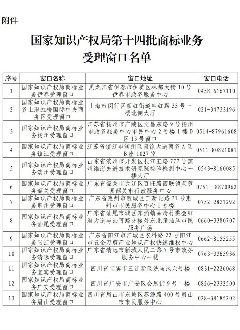 附件:国家知识产权局第十四批商标业务受理窗口名单