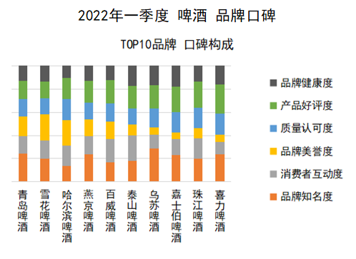 8、综合来看,2022年一季度啤酒TOP10品牌的口碑构成如下图所示: