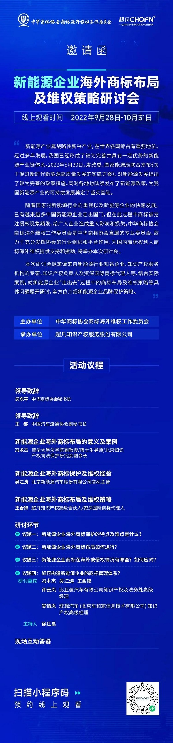 本次研讨会邀请来自新能源行业知名企业、知识产权服务机构的专家、知识产权负责人及资深国际商标代理人等,结合实际案例,就新能源企业“走出去”过程中的商标布局及维权策略等具体问题展开研讨,全方位介绍新能源企业品牌保护策略。