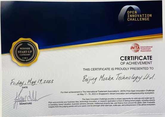 5 月17 日-19日,INTA首届开放式创新挑战赛在INTA第145 届年会期间举办。中华商标协会数字化工作委员会执行主任单位北京摩知轮科技有限公司凭借创新AI专业检索、分析及管理服务模式,经过与诸多参赛选手激烈角逐,5月19日,在新加坡金沙会展中心举办的总决赛中摘得(初创企业组)冠军!