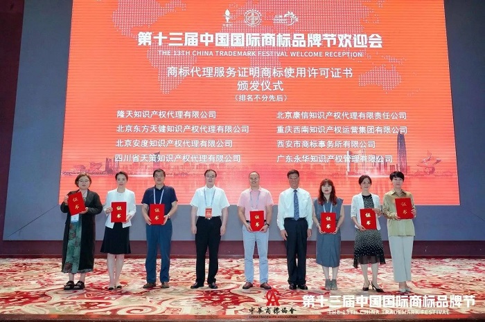 在第十三届中国国际商标品牌节欢迎会上,举行了第三批商标代理服务证明商标使用许可证书颁发仪式,为隆天知识产权代理有限公司、北京康信知识产权代理有限责任公司、北京东方天健知识产权代理有限公司等8家代理组织颁发了商标代理服务证明商标使用许可证书。