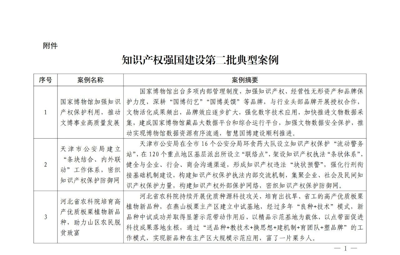 为深入贯彻落实中共中央、国务院印发的《知识产权强国建设纲要(2021—2035年)》和国务院印发的《“十四五”国家知识产权保护和运用规划》,总结提炼各地区在推进知识产权强国建设中的经验做法,发挥典型示范引领作用,国务院知识产权战略实施工作部际联席会议办公室从全国范围内选取了30个创新性强、成效较为突出、具备复制推广价值的案例,作为知识产权强国建设第二批典型案例。现予以印送,供各地区在推进知识产权强国建设工作中综合借鉴。