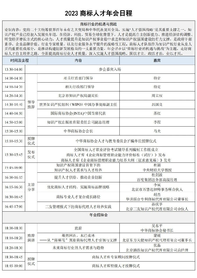 国以才立,政以才治,业以才兴。在迈向社会主义现代化国家新征程的关键时期,党的二十大对“实施科教兴国战略,强化现代化建设人才支撑”作出专门部署。人才是增强自主创新能力、优化经济结构调整、转变经济发展方式的第一资源。高素质知识产权人才是知识产权事业稳中求进和知识产权强国建设的有力支撑。商标人才队伍作为知识产权行业从业人员的重要组成部分,是推动构建创新发展格局的一支重要力量。人才质量提升是提高政府干部素养、增加企业品牌价值、升级行业服务水平的战略性工程。在此背景下,我们决定于2023年12月22日在北京举办“2023商标人才年会”,以“商标行业的机遇与挑战”为主题,围绕商标人才战略,共同研讨新发展阶段如何激发在商标行业中人才发展的新动能,共同探讨新时代商标人才工作与服务的新思路、新模式、新作为,助力知识产权强国建设。