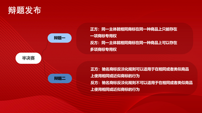 第四届“万慧达杯”中华商标协会全国高校知识产权(商标)热点问题辩论赛半决赛将于6月1日在北京友谊宾馆颐园写字楼举行。
