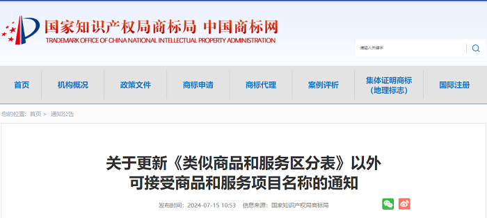 关于更新《类似商品和服务区分表》以外可接受商品和服务项目名称的通知