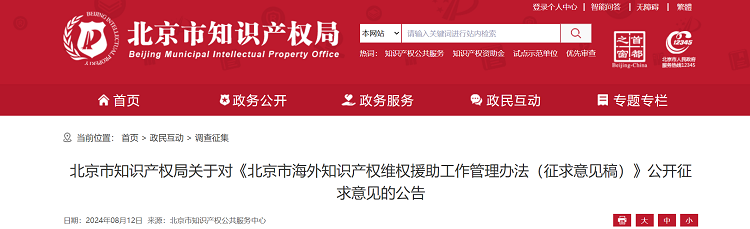 为提升本市知识产权涉外风险防控水平,规范本市海外知识产权维权援助工作,根据《知识产权强国建设纲要(2021—2035年)》《关于强化知识产权保护的意见》《北京市知识产权保护条例》等法规文件精神,结合北京市实际情况,北京市知识产权局研究起草了《北京市海外知识产权维权援助工作管理办法(征求意见稿)》,现面向社会公开征求意见,欢迎社会各界提出意见和建议。