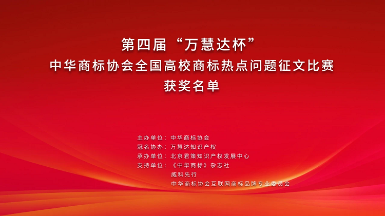 为深入贯彻落实党中央、国务院关于知识产权工作的决策部署,推进以“尊重知识、崇尚创新、诚信守法、公平竞争”为核心的知识产权文化建设,普及商标法律知识,促进知识产权人才培养,加强商标理论与实务的学习和交流,我会举办了第四届“万慧达杯”中华商标协会全国高校商标热点问题征文比赛。经过专家评审,现将获奖名单公告如下: