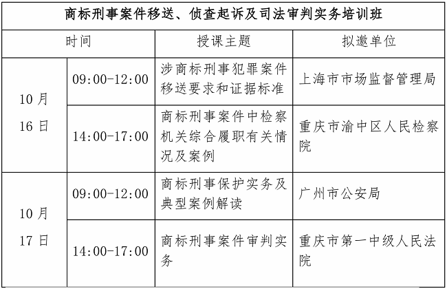 为帮助会员深入了解商标案件行刑衔接工作机制,学习侵犯商标权刑事案件审判要旨,掌握有关机关案件移送程序和证据要求,加强刑事法律和司法解释有关侵犯商标权条款的理解与适用,中华商标协会拟于10月16-17日在重庆举办“商标刑事案件移送、侦查起诉及司法审判实务”培训班。培训相关安排如下: